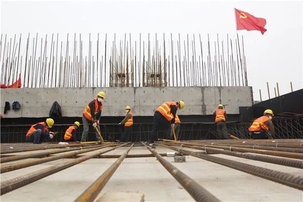 在引江濟(jì)淮工程樅陽樞紐節(jié)制閘施工現(xiàn)場(chǎng),從高處望去,工地上一片繁忙景象,幾臺(tái)挖掘機(jī)揮動(dòng)著“機(jī)械臂”,戴著安全帽和白色口罩的工人們正在鋪設(shè)鋼筋。